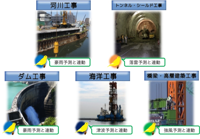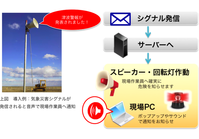 従来は、測器で実際に観測したデータや気象警報の発表を、現場作業員が声で通知していた。『気象注意喚起伝達システム canary(カナリー)』は、現場ピンポイントの気象予測と連動。天気の急変・悪天が予想された場合、地震や津波が発生した場合、自動音声システムによって音声と光で現場へ伝達。