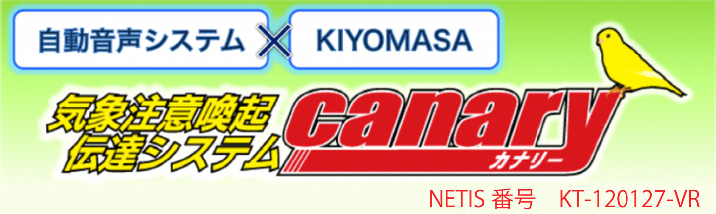 『気象注意喚起伝達システム canary(カナリー)』は、自動音声システムとKIYOMASA PROのコラボレーション商品です。KIYOMASA PROの現場ピンポイント予測で、豪雨や落雷・突風などの気象災害シグナルが発信され、現場に設置されているサイレンやスピーカー、回転灯により作業員へ音声や光で危険を通知します。
