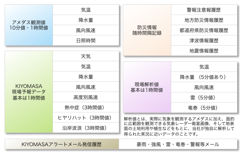 取り出せるデータは、アメダス実況や現場の解析データ、またKIYOMASA PRO予報データ、さらには地震・津波情報履歴などです。例えば、ゲリラ豪雨や強風で建設工事を中止した場合に、そのときの予報データや実況の雨や風データを取得することができます。発注者へ提出することで、作業中止時の根拠の提出が可能です。