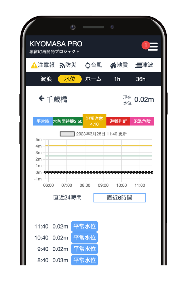 国土交通省が設置している水位観測所の水位をグラフとテキストで表示。24時間前から現在時刻までどのような水位変化だったのか確認することができます。