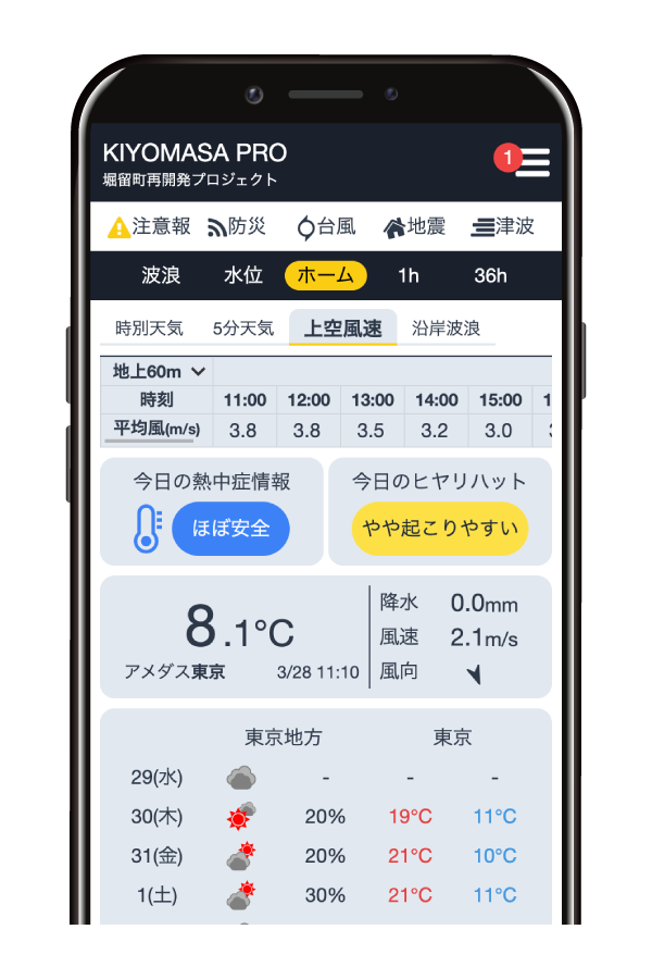 また、風向についても直観的に判断できるよう、矢印で表示しています。より詳細に強風のピークタイムがわかり、高所作業の可否判断や、クレーン の転倒対策を取ることができます。