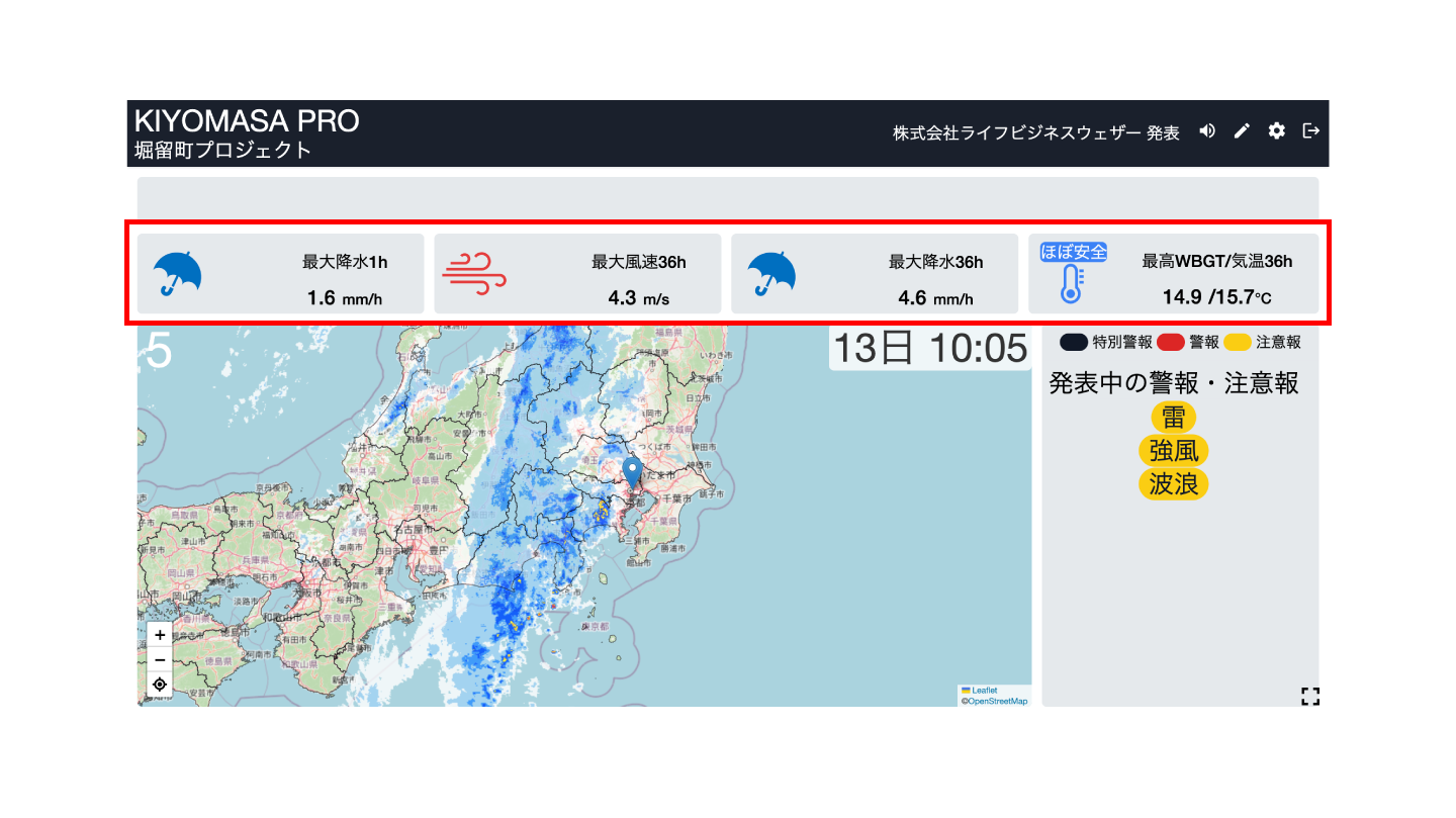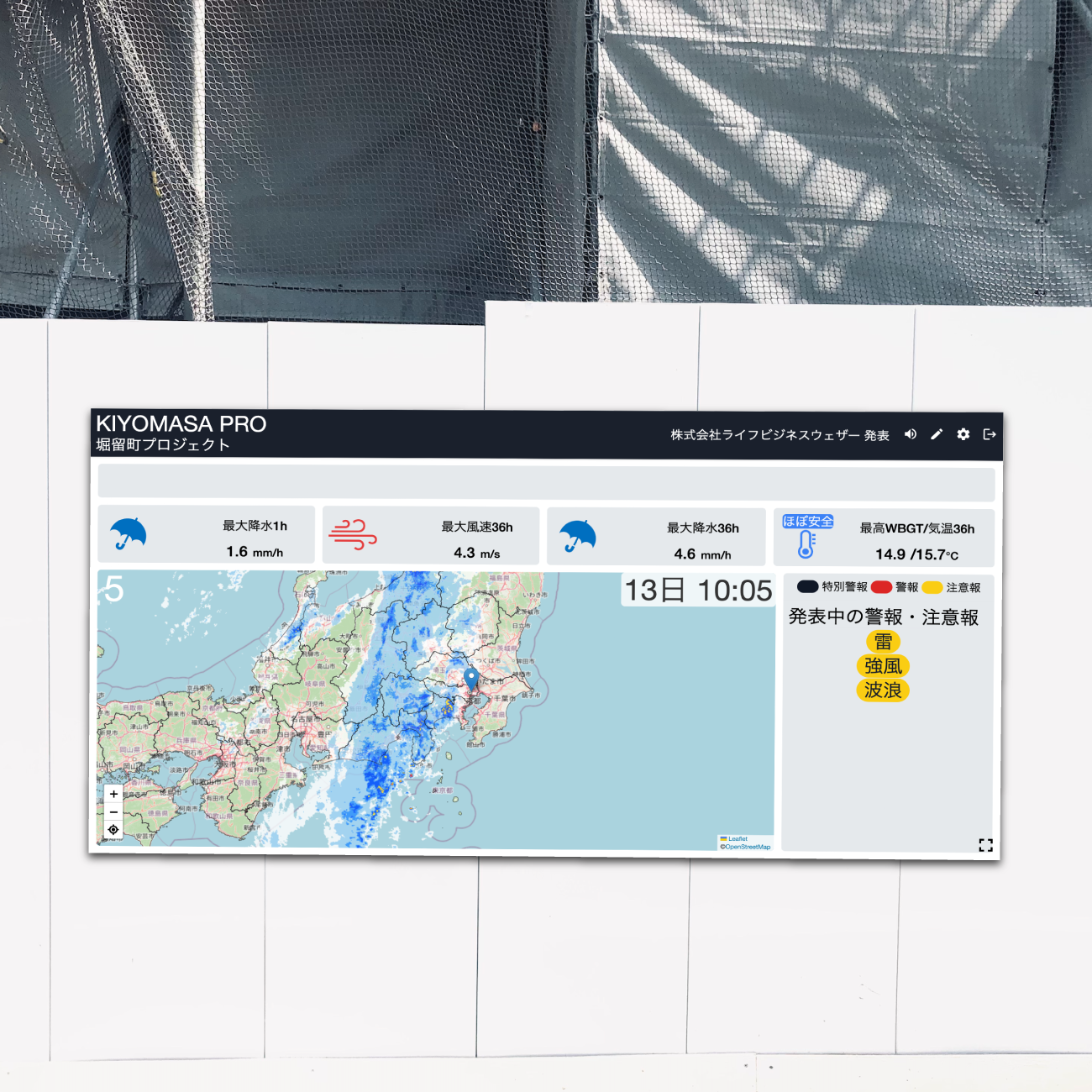 雨雲からグラフへの表示切替時間やグラフの目盛間隔、通知時間のインターバルなど、現場ごとに調整できます。何度でも変更できるため、運用しながら効果的に注意喚起できるよう、現場に合った見え方を探してみて下さい。
