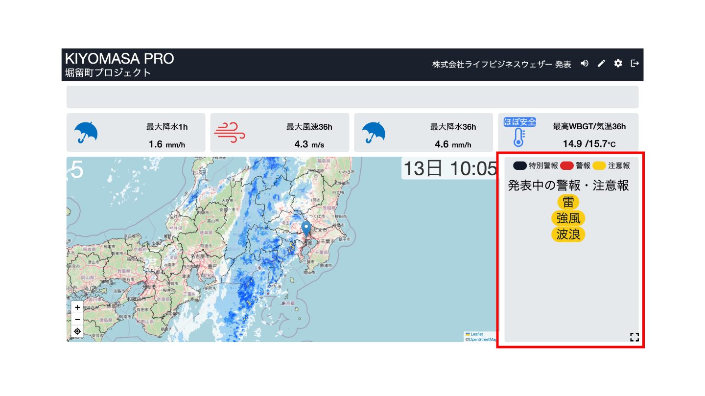 基準を超える降水量や強風、 WBGT値が発表された場合に、ポップアップと音声で警告を行うサービスです。